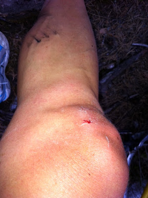 Efter middagen var mannen sugen på att trampa MTB och det tycker jag ju är riktigt skojigt, så jag hängde med. Dessvärre så var det inte min dag där bland stockar och sten; först lyckades jag köra fast med framdäcket i springan mellan två spångar. Jag gjorde en ordentlig vurpa över styret och kraschade som tur var på sidan av spången. Blodvite uppstod på mitt knä och jag kan säga att jag var raskt uppe igen för att känna om knäna hade farit åt fanders så att jag inte skulle kunna springa. Men de klarade sig bra, de blev bara lite ömma.